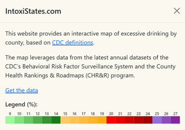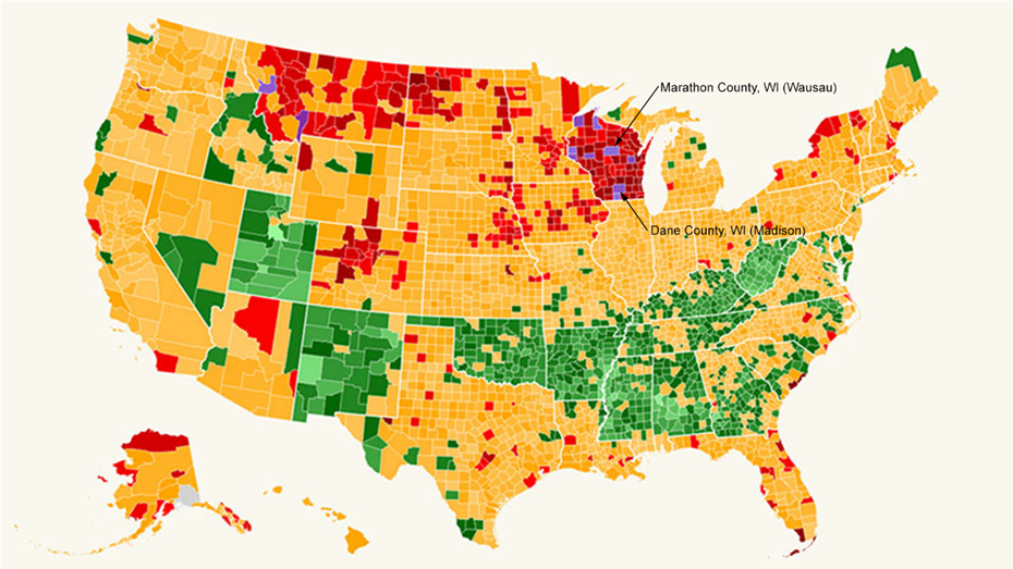This map shows CDC rates of alcohol abuse/excessive drinking by county. This is annotated to show the locations of Dane County (Madison) and Marathon County (Wausau).