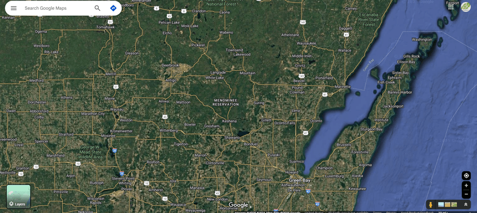 GoogleEarth aerial photographs show the alignment between cultural values and land use. The screenshot below shows an area of northeast Wisconsin centered on Menominie County, the Menominee Indian Reservation.