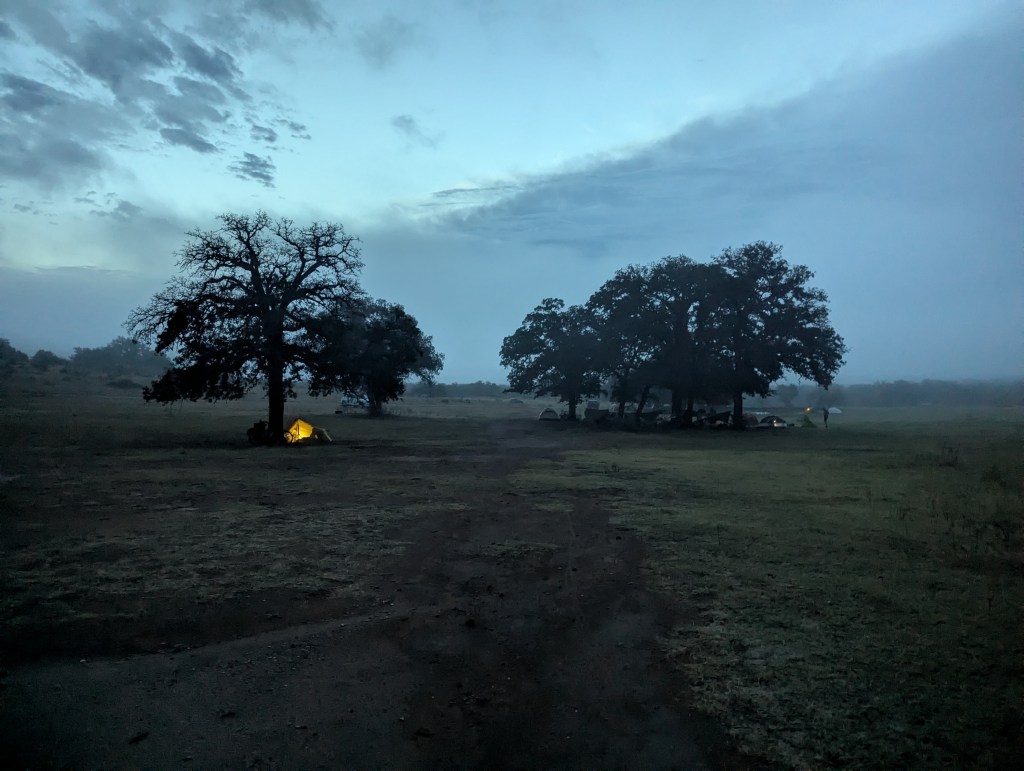 A strong storm hit us the first night and not many slept. This was the campground for the first night south of Llano somewhere. The morning was misty and cool and I was the first to hit the road, thru hiker style.