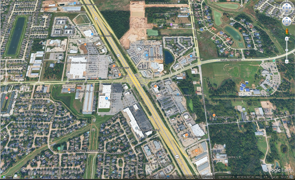 Now Walmart is left of the bottom. The area east of 249 is a flood area, and it’s speculation that runoff from the Walmart site is discharged under the highway to this area. That’s a tributary of Cypress Creek that runs NW-SE through the upper right called Pillot Gully.